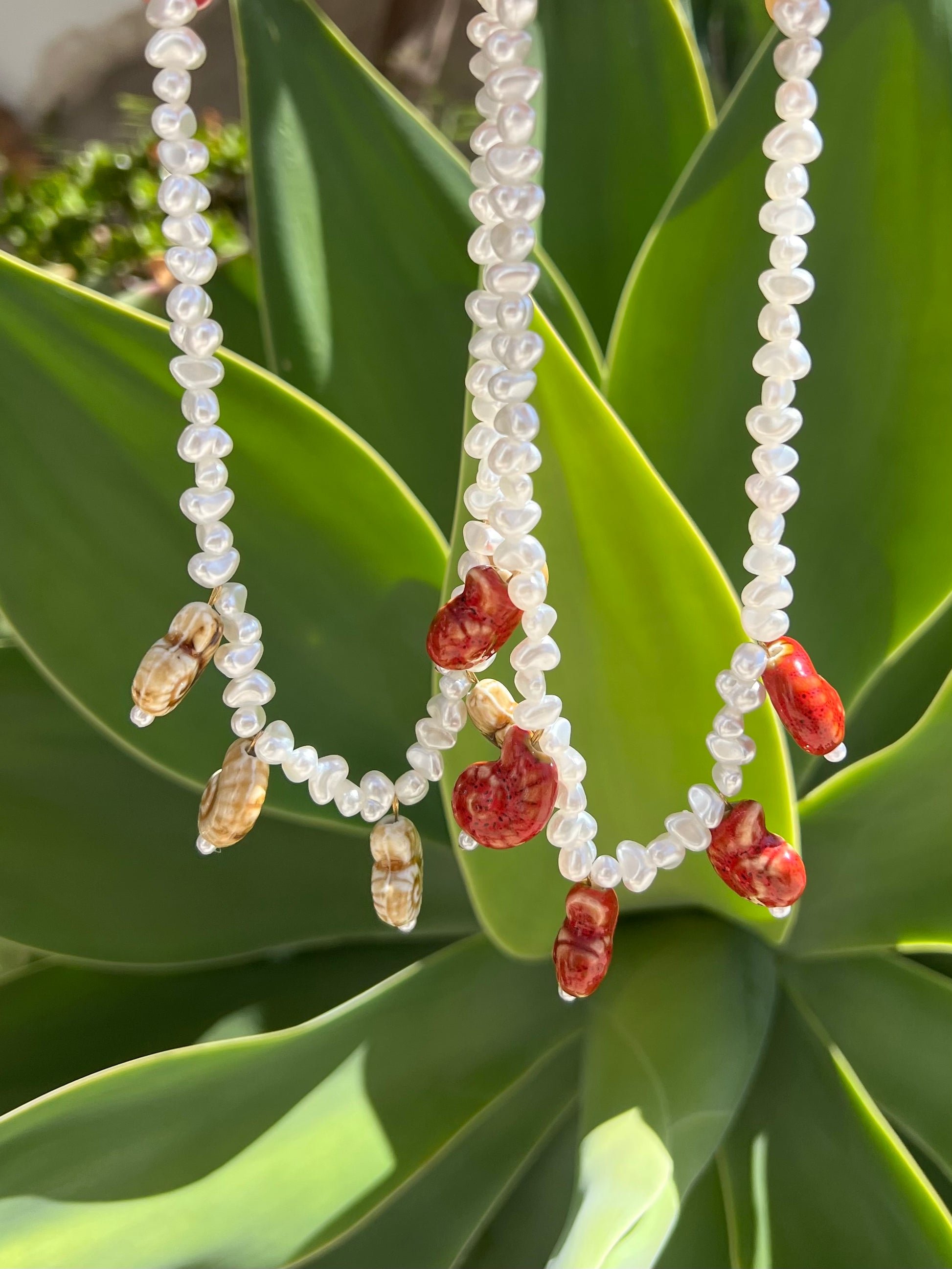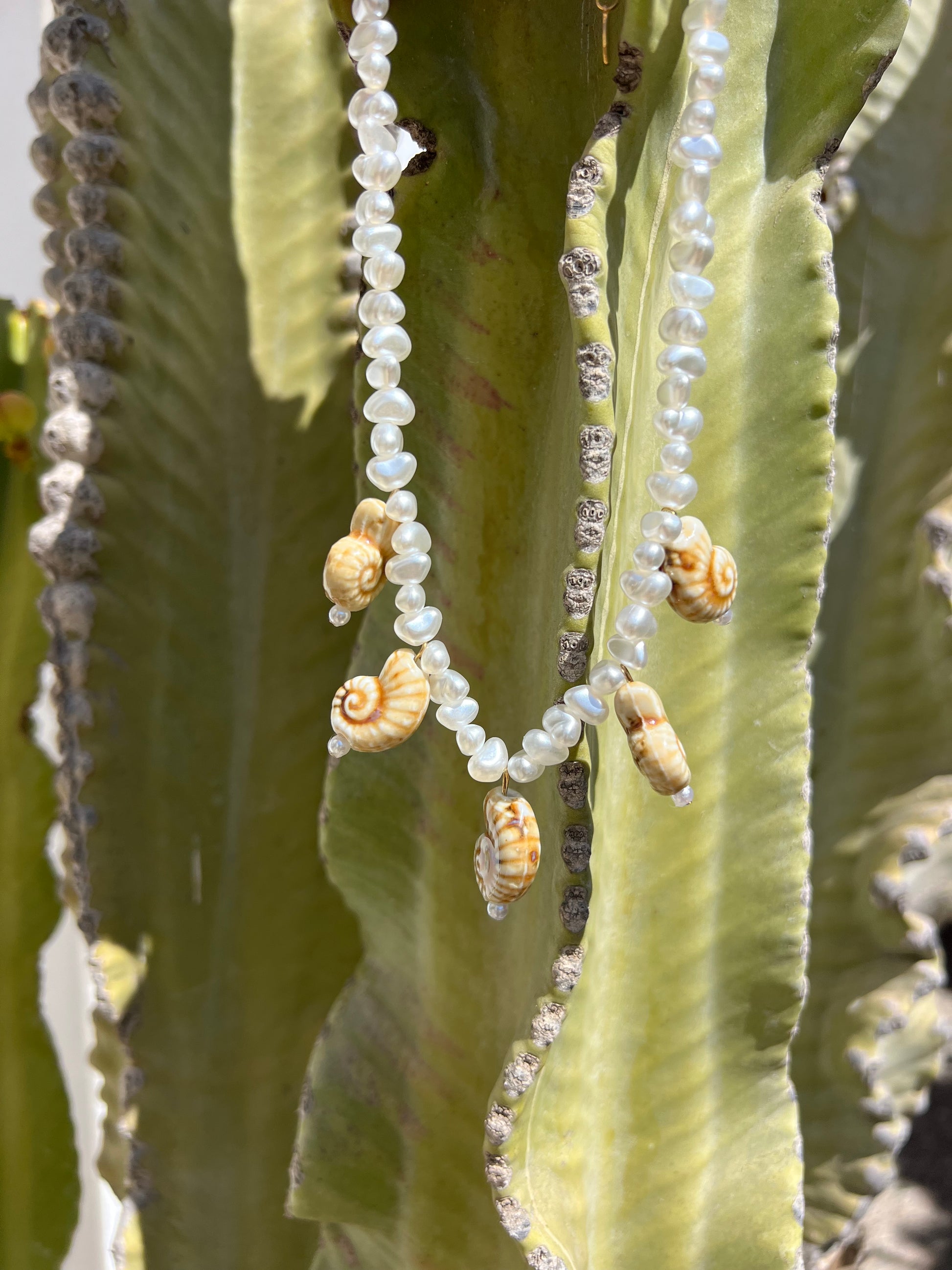 Collar de perlas con 5 conchas de cerámica. Cierre dorado de acero inoxidable. Medida 37-43 cm (cierre ajustable).