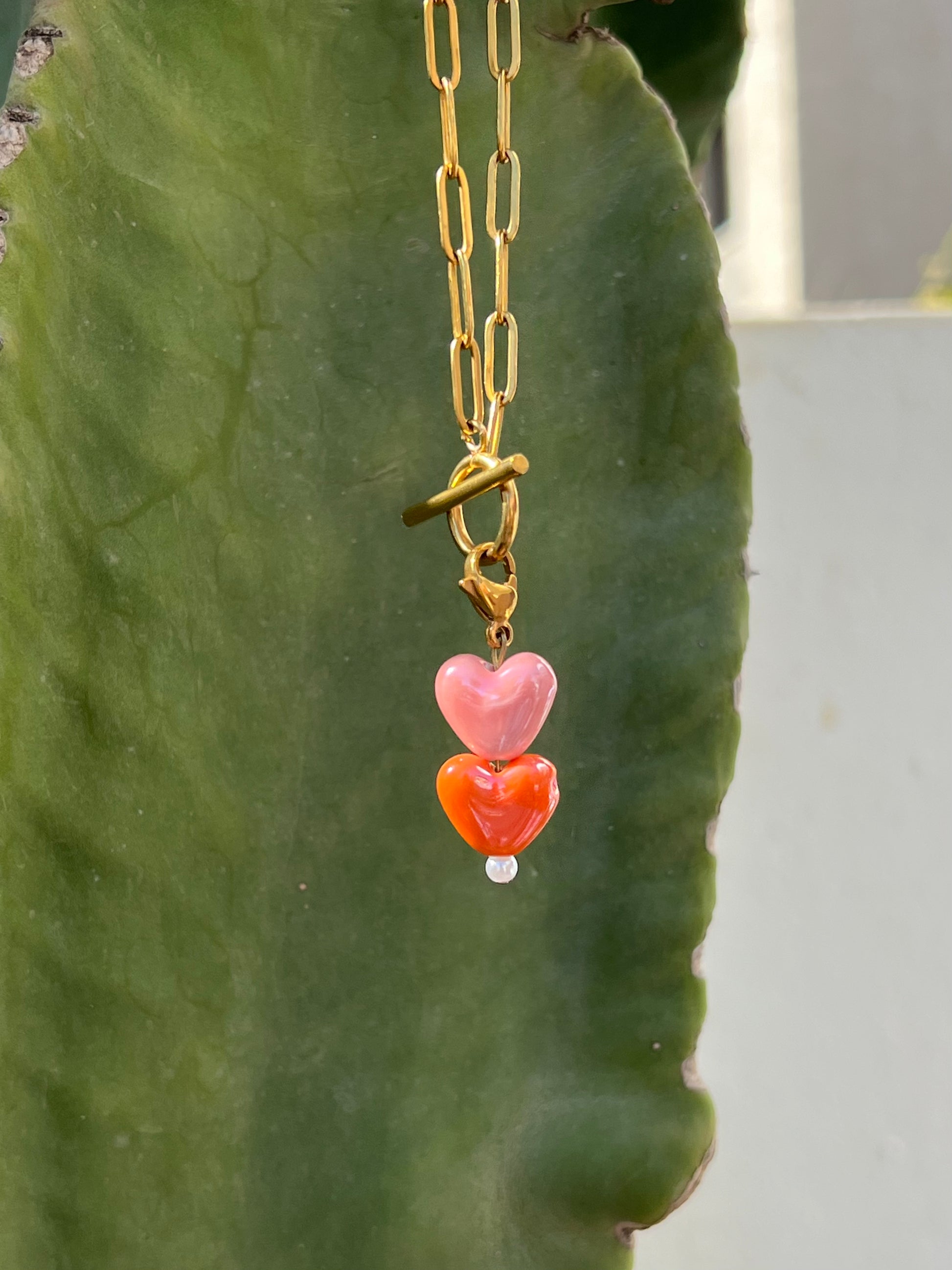 Charm de corazón rosa y naranja. Cierre dorado de acero inoxidable. No incluye la cadena
