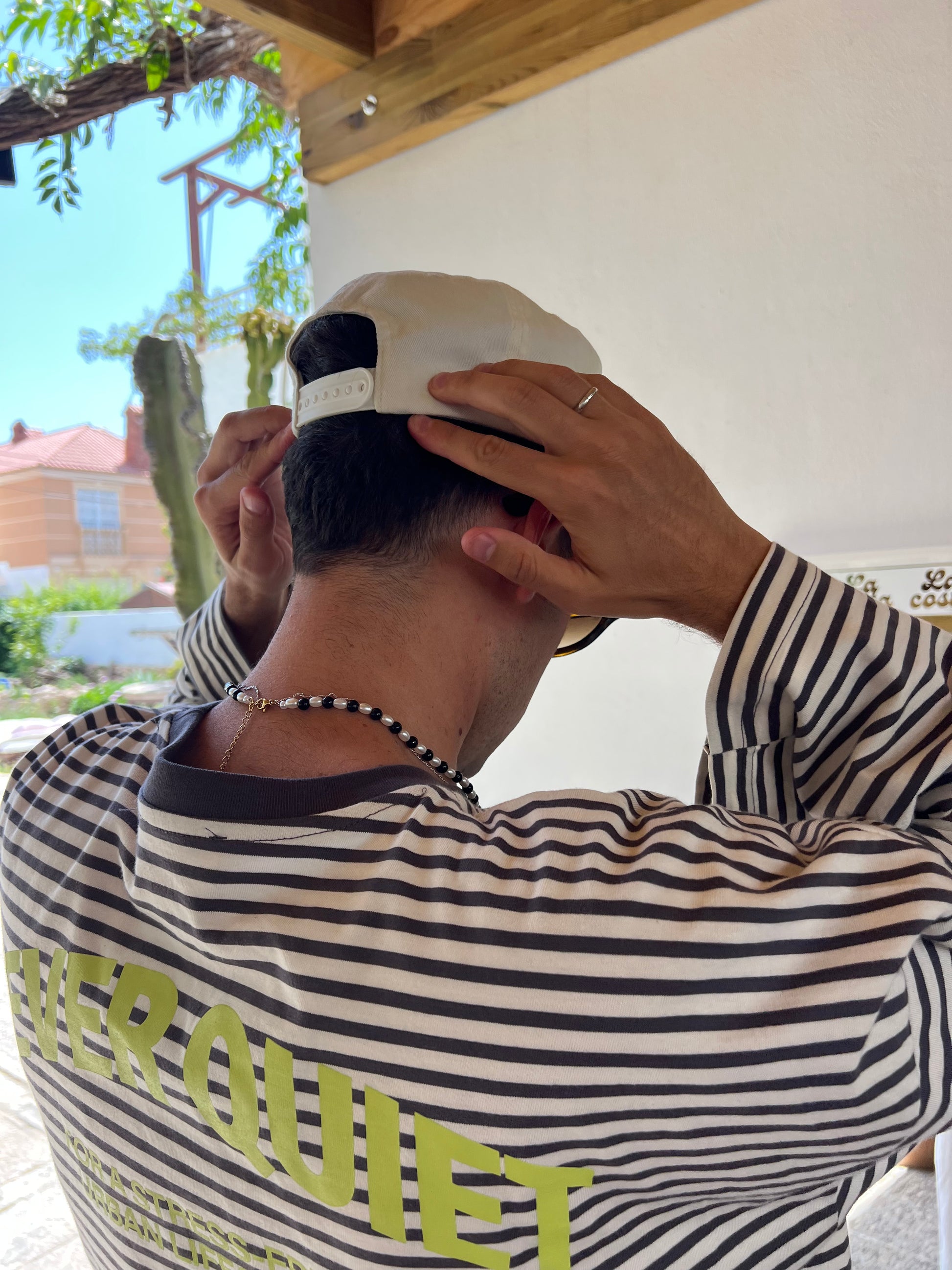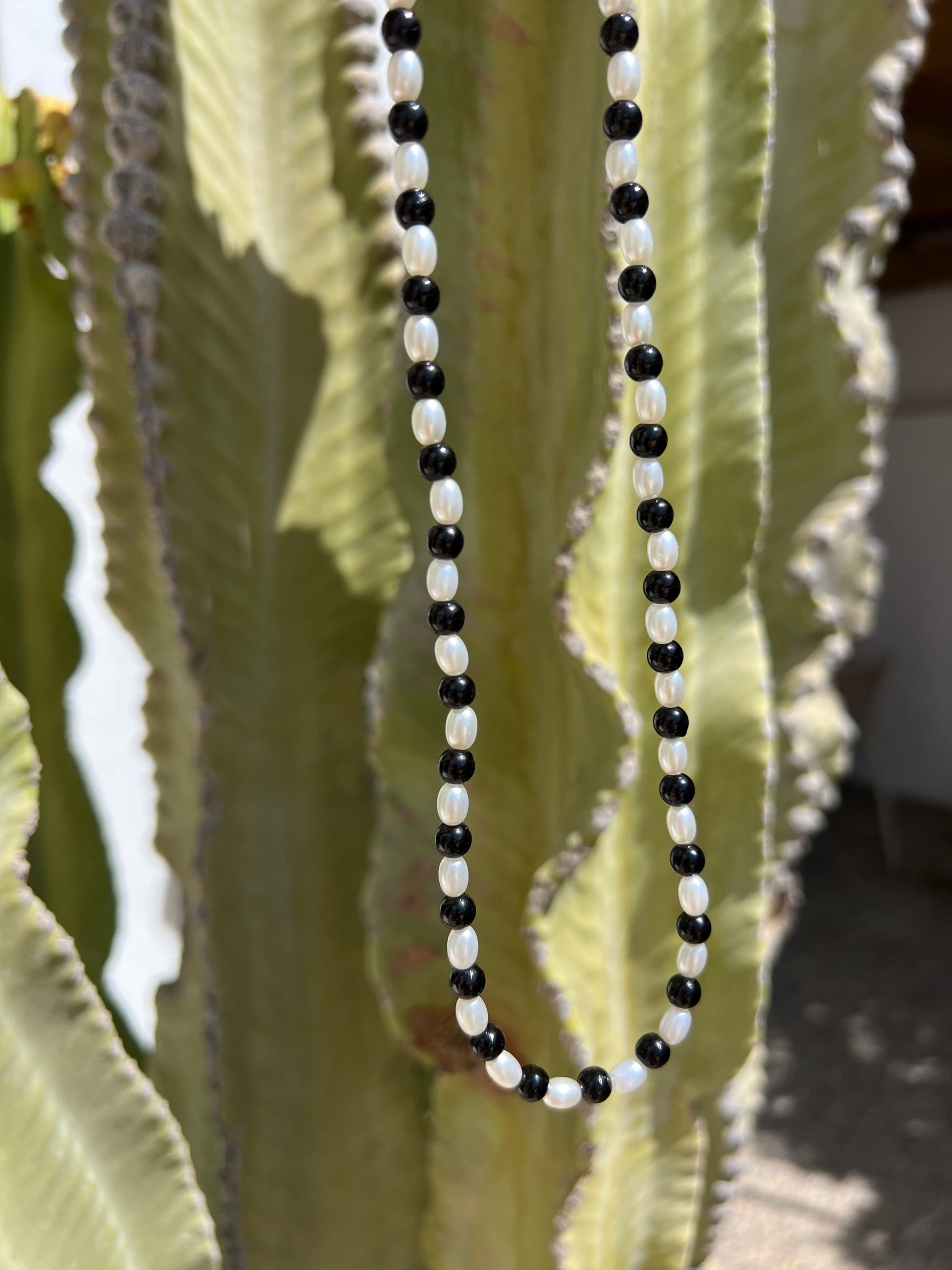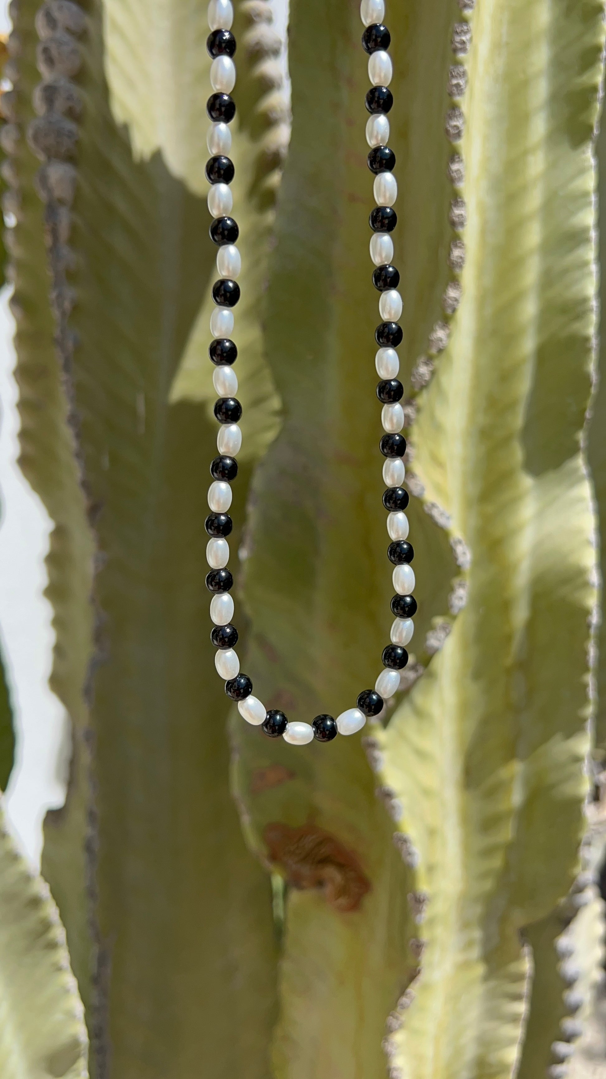 Collar de perlas blancas y negras con cierre ajustable dorado de acero inoxidable.